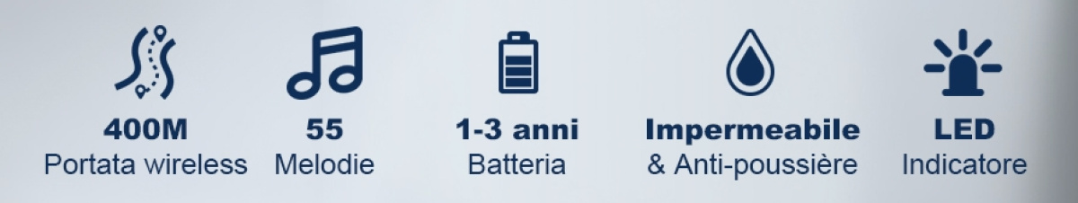 Campanello wireless ad ampio raggio puo' essere posizionato ovunque,senza vincoli legati alla presenza di prese elettriche, per la trasmissione del segnale fino a 400 metri in campo aperto.