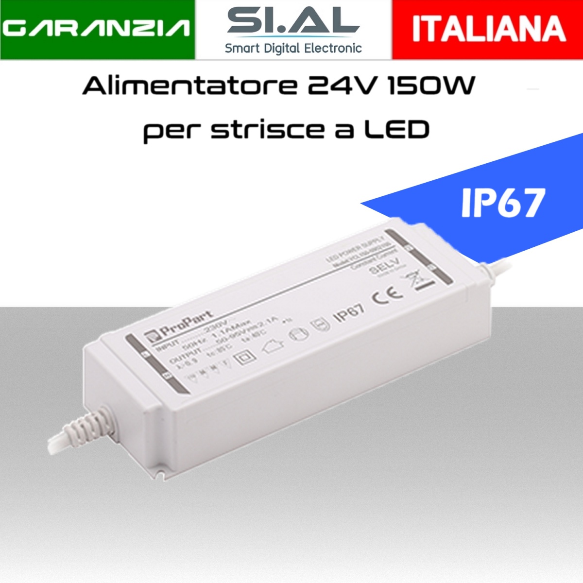 Alimentatore switching IP67 da 150W compatto , ideale per tutti i prodotti che si alimentano a 24V DC come lampadine a led, faretti a led, strisce led, fari led ,apparecchi audio-video,videosorveglianza. Questo trasformatore puo' essere installato sia in verticale che in orizzontale,in qualsiasi ambiente.E' progettato in modo tale da garantire un alto livello di sicurezza, essendo provvisto di protezione da sovraccarichi e cortocircuiti. I trasformatore è gia' pre-cablato con cavi di alimentazione sia in entrata che in uscita.