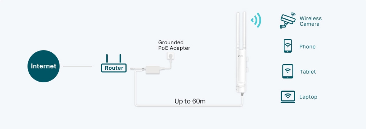 Access point Wi-Fi Gigabit Poe dual-band a lungo raggio, progettato per estendere la copertura di rete wireless in ambienti all’aperto ( Weatherproof ) in spazi di grandi dimensioni come giardini, cortili, terrazze,campeggi, agriturismi, stabilimenti balneari,cortili di aziende, scuole o università,aree pubbliche o parcheggi,capannoni.